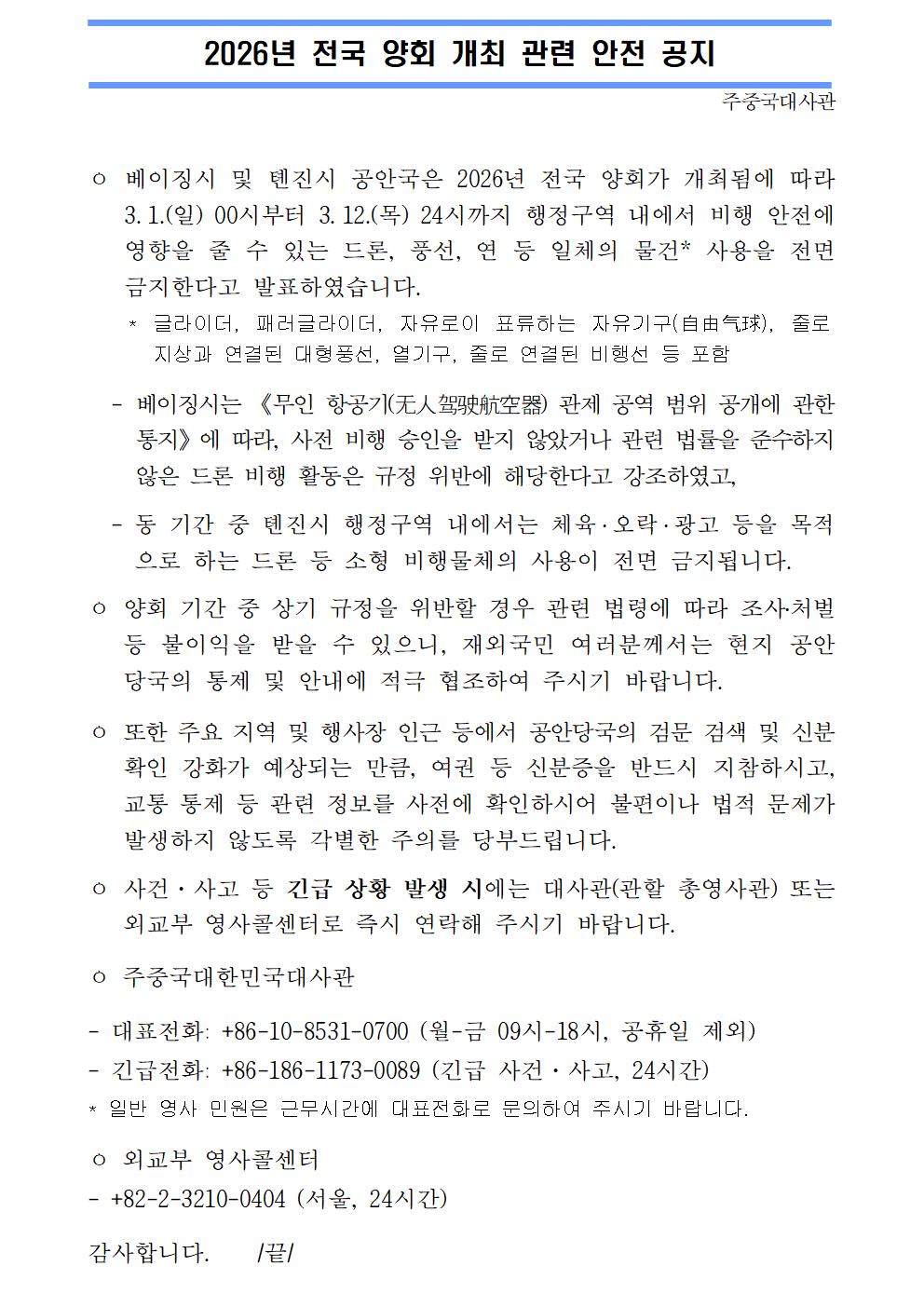 설·중국 춘절 연휴기간 사건사고 예방 안전공지