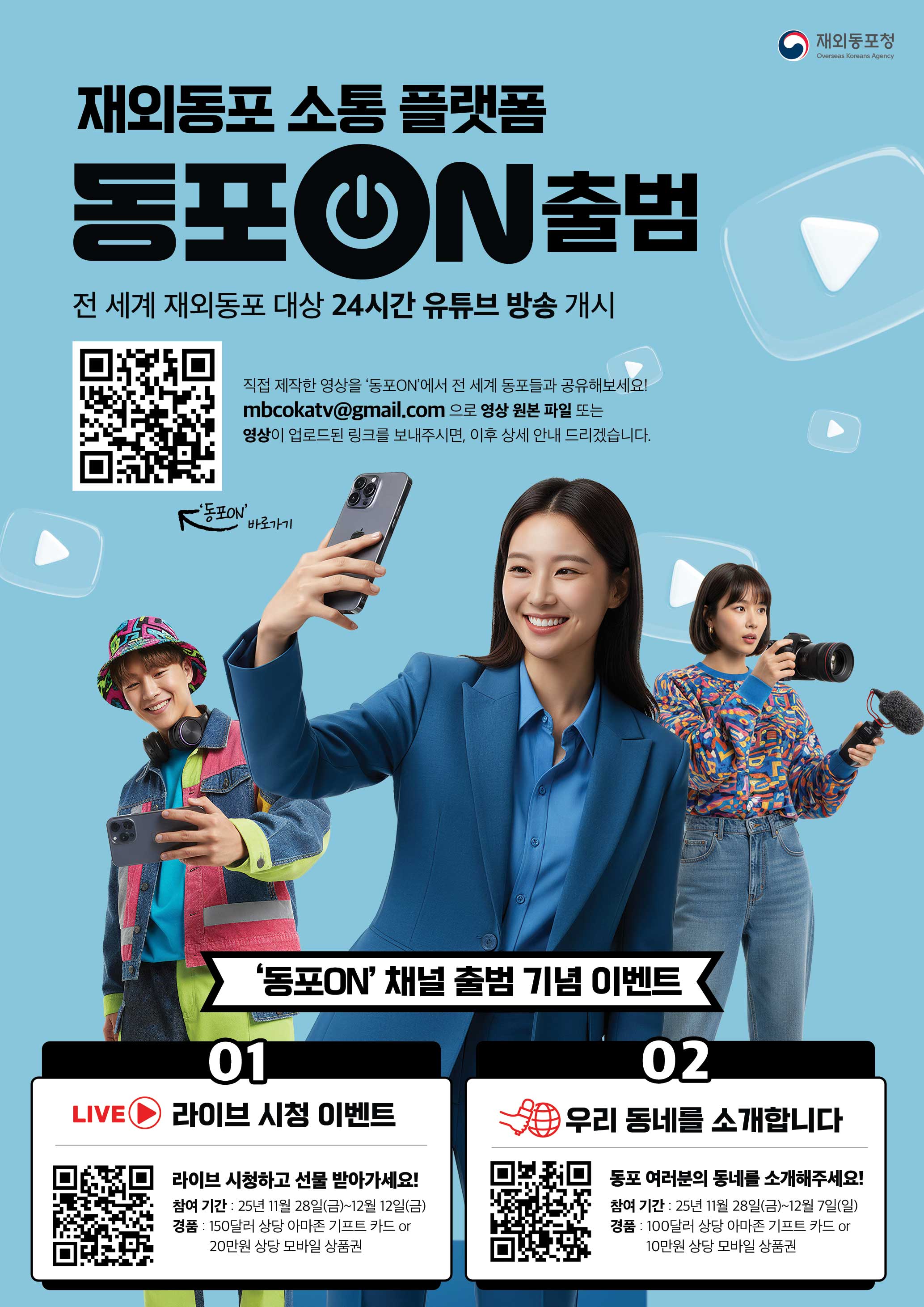재외동포청은 전 세계 700만 재외동포와의 소통을 강화하고 동포 정책에 대한 접근성을 높이기 위해 재외동포 소통 플랫폼 "동포ON"을 출범하여 재외동포청 유튜브를 통해 24시간 콘텐츠 송출을 시작합니다. 재외동포 여러분들의 많은 관심과 이용 부탁드립니다.